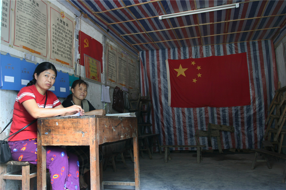 由于古镇拆迁,巫溪宁场古镇临时居委会。居委会干事在临时搭起的棚子里“办公”。 拍摄时间:2007年10月3日;地点:重庆巫溪宁场古镇。